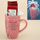 The Friends Like You Coffee Mug Gift Set is a thoughtful and unique gift for a treasured friend's birthday or other event. It reads: "Friends like you only happen once in a lifetime." © Havoc Gifts The gift set includes the mug and two packages of gourmet coffee - 1 Breakfast Blend and 1 French Vannilla. Each pack makes 8-10 cups of delicious coffee. Product Info Size: Standard Size Coffee Mug Other: This item comes wrapped in cellophane with a bow - no wrapping required.